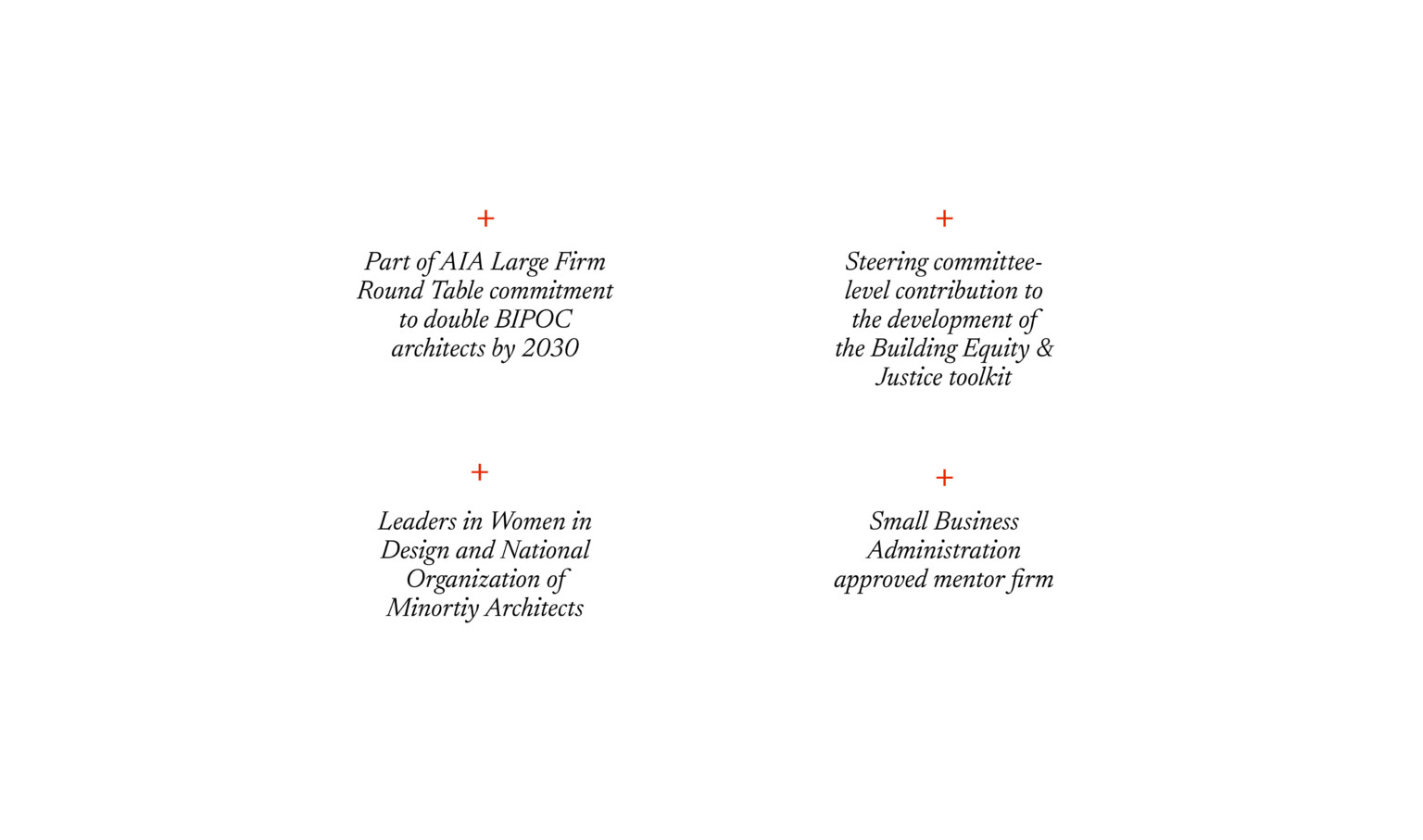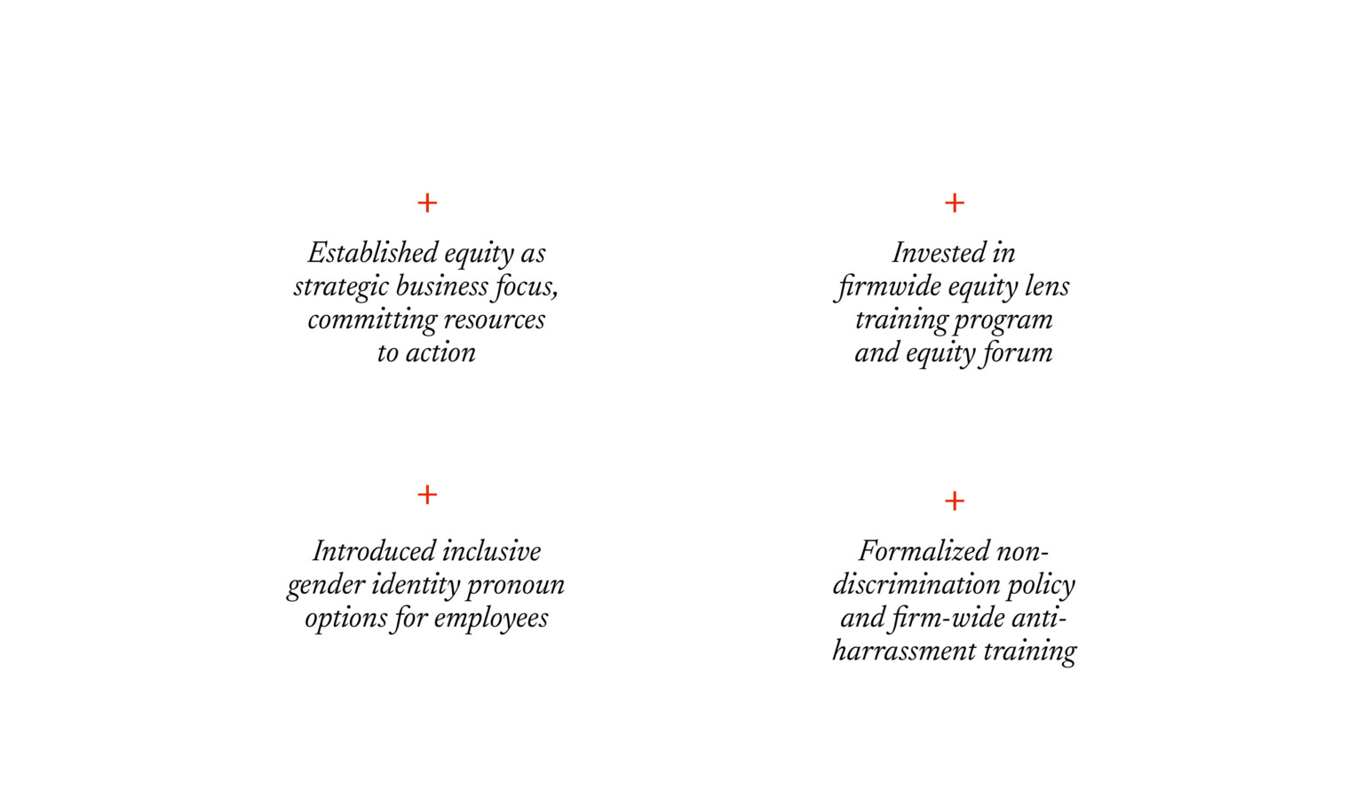 Real, lasting change starts by holding up a mirror aiming to understand not only the systems and institutions that form the basis of our society, but also the interpersonal and individual experiences in our offices. To this end, we have: