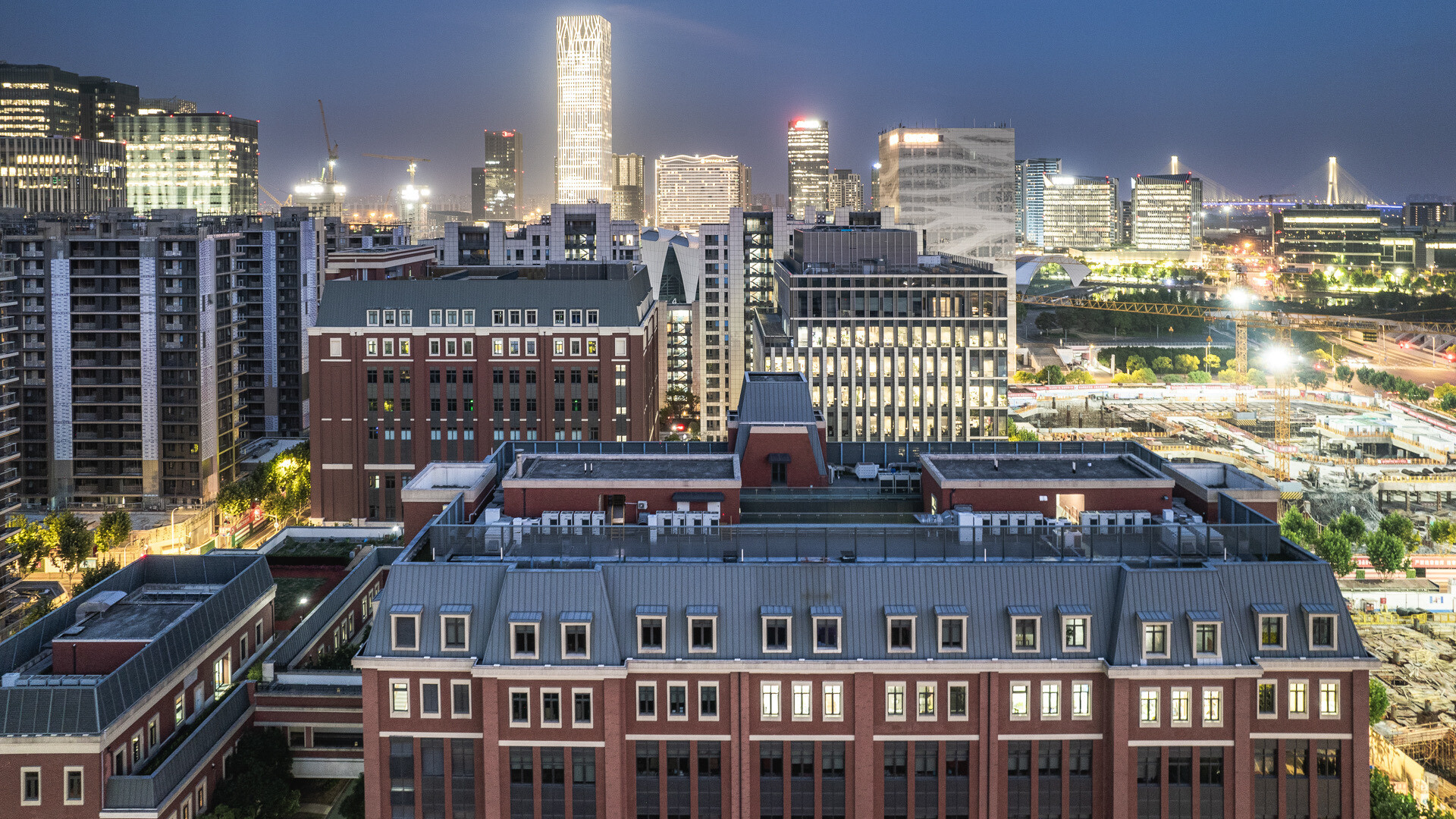 Baoshan Long Beach Complex illuminated at night along Shanghai's Yangtze River, diamond geometric light on cylindrical tower
